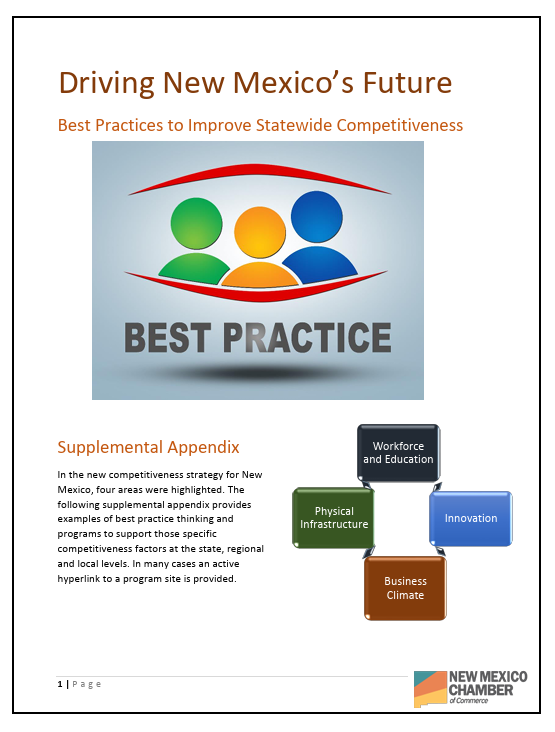 Drawing from proven strategies across the country, this appendix highlights real-world programs and policy approaches that strengthen workforce development, infrastructure, innovation, and business climate. Designed as a practical companion to the broader strategy, it offers actionable examples that can be adapted to accelerate New Mexico’s economic competitiveness.